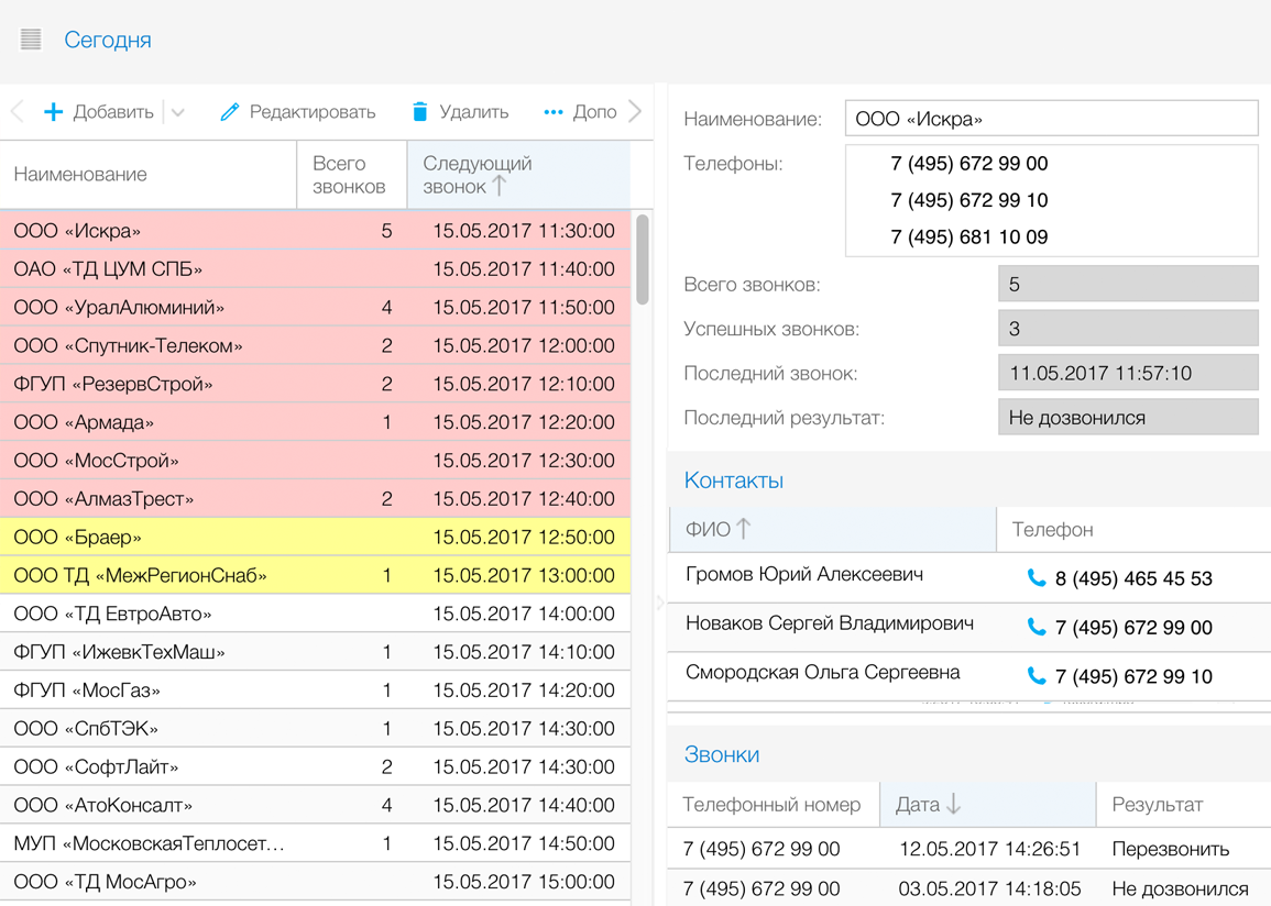 Решение поможет повысить эффективность активных продаж и переговоров по телефону. Система позволяет загружать базы данных с контактами, настраивать сценарии переговоров в графическом редакторе, распределять работу между сотрудниками, выполнять звонки в один клик и отправлять письма из интерфейса системы, контролировать и оптимизировать работу персонала, всегда иметь под рукой историю общения с каждым клиентом и записи разговоров.