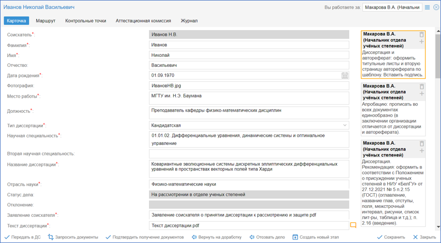 Автоматизация всех этапов процесса аттестации научно-педагогических кадров высшей квалификации, начиная с подготовки и подачи соискателями пакетов документов для защиты диссертаций до аттестационной комиссии и утверждения результатов ученым советом. В системе заложены функции автоматического формирования документов: дипломы, заявления, описи дел, протоколы, приказы, ходатайства, выписки и отчеты.