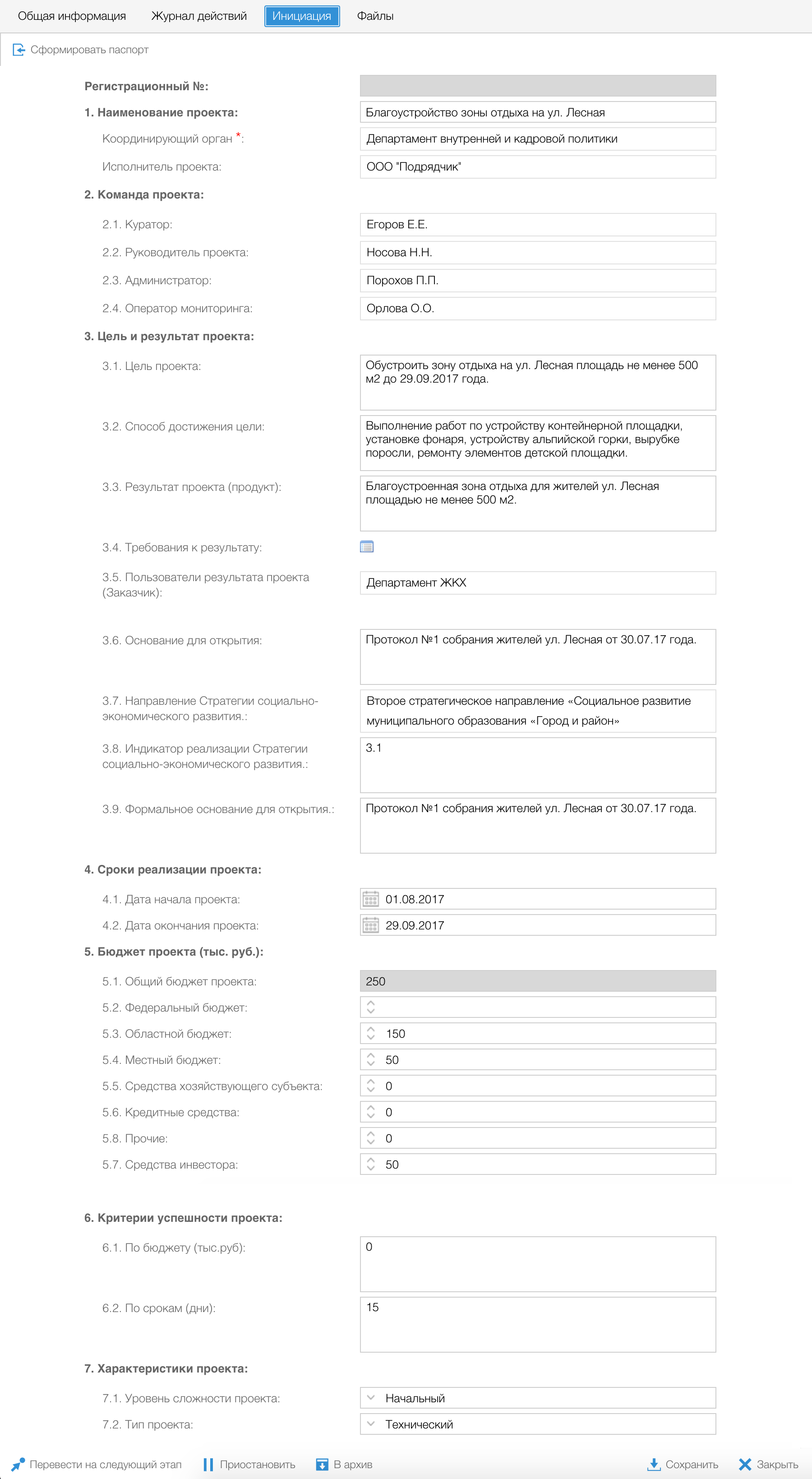 • автоматическая регистрация проекта на основе одобренной инициативной заявки и присвоение карточке проекта регистрационного номера.