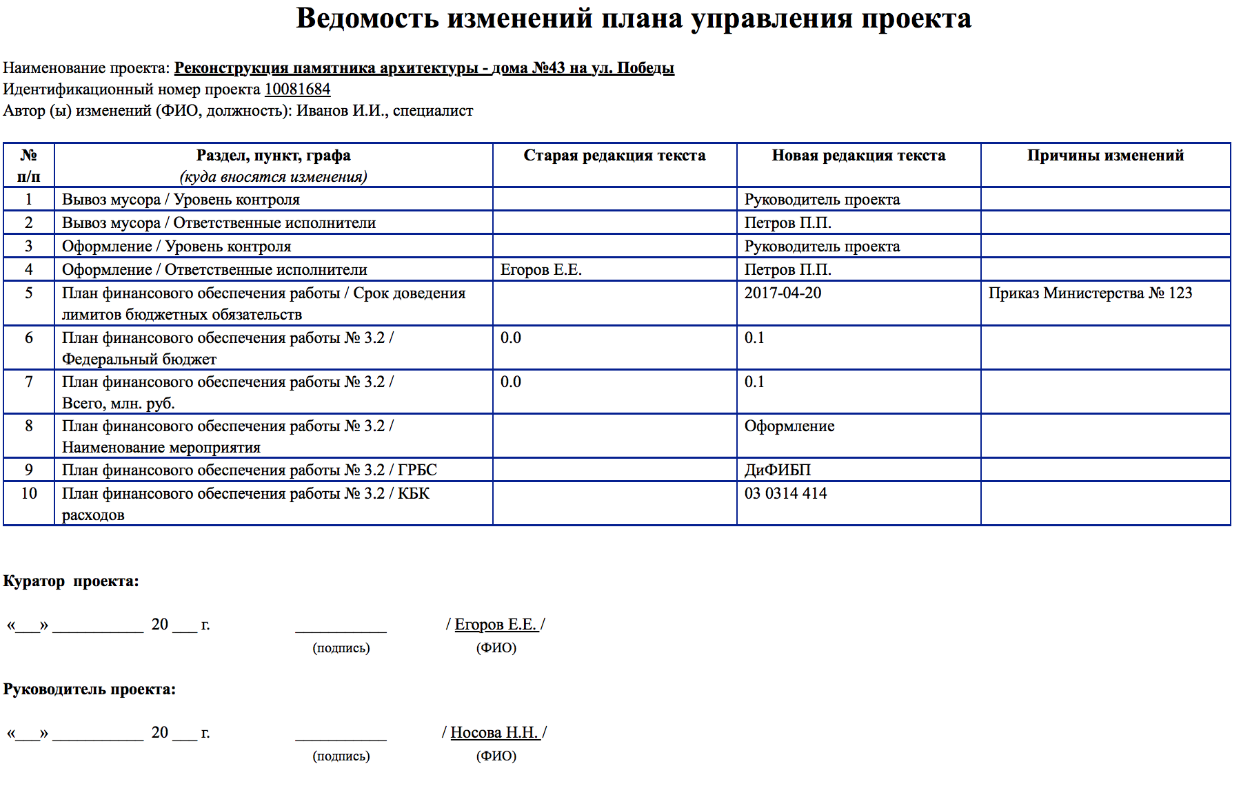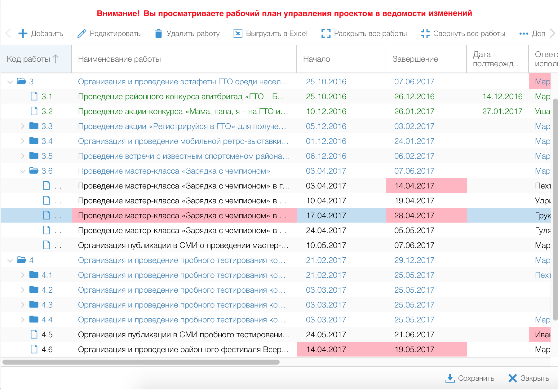 • удобное редактирование рабочего плана и паспорта проекта с индикацией изменённых записей;
