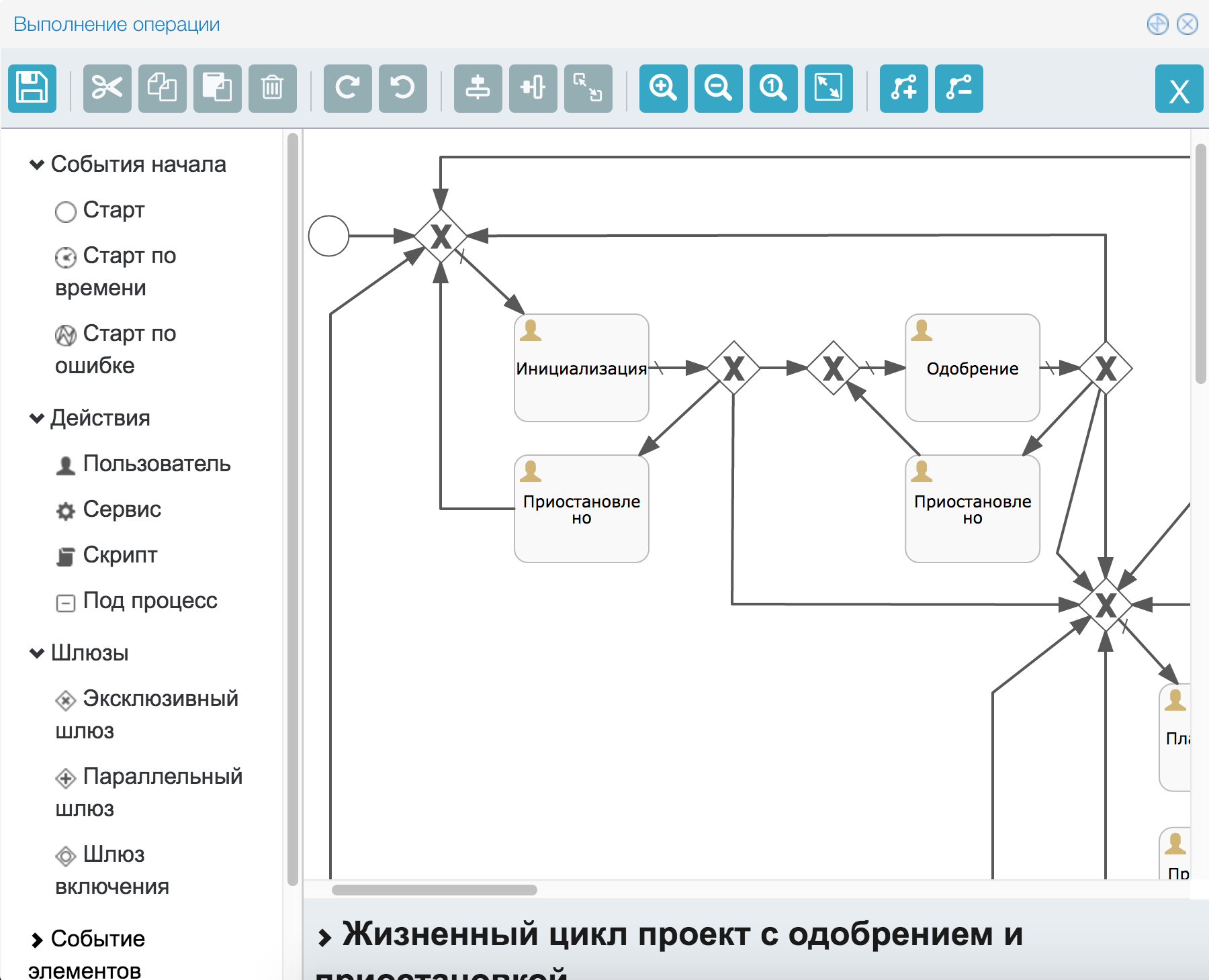 • редактирование схемы жизненного цикла проекта и бизнес процессов (БП) с использованием нотации BPMN 2.0;