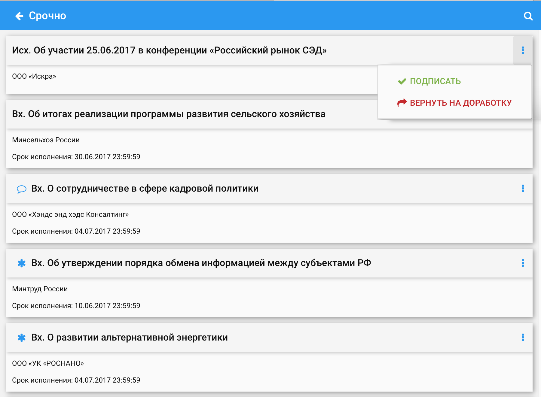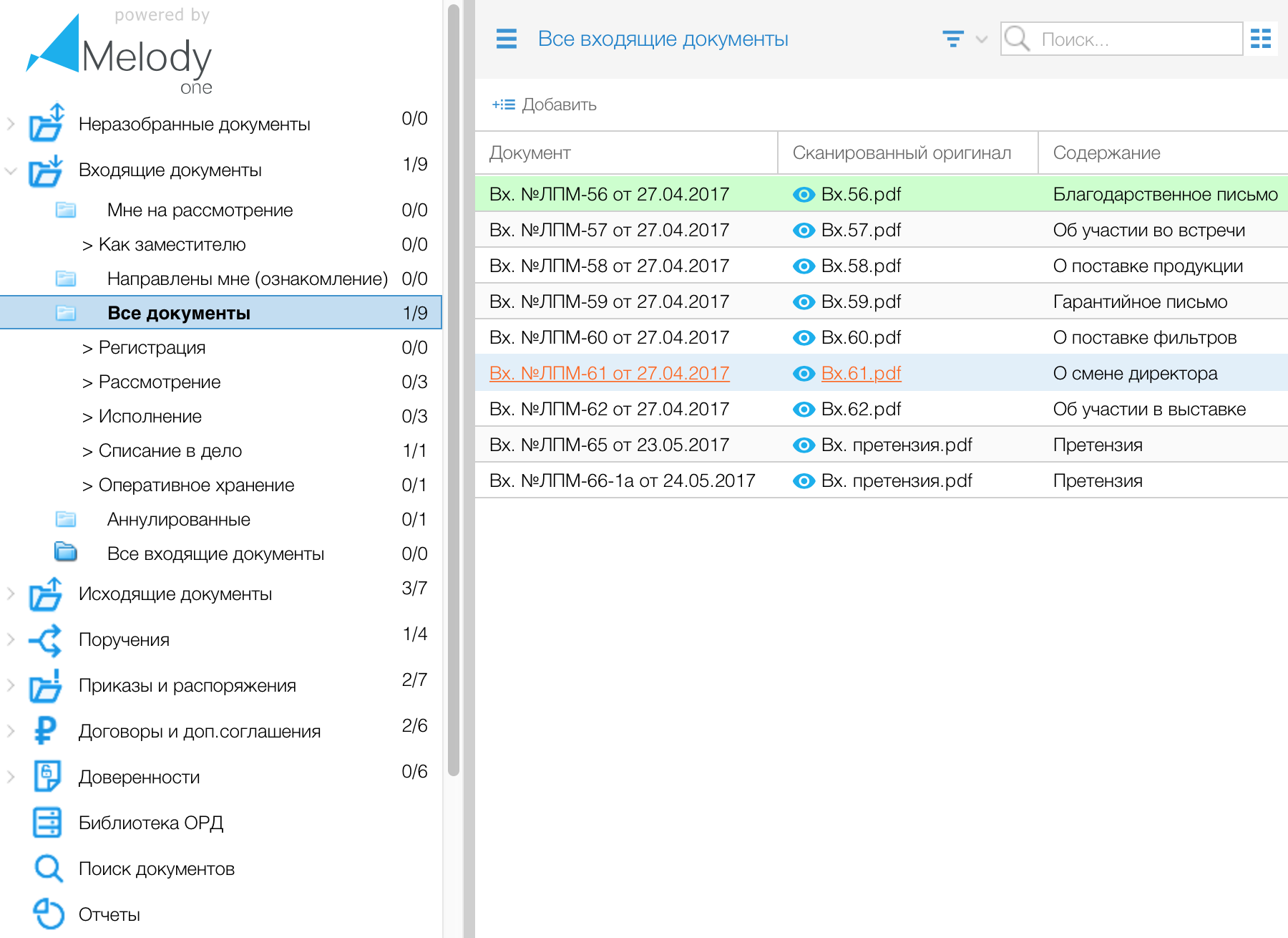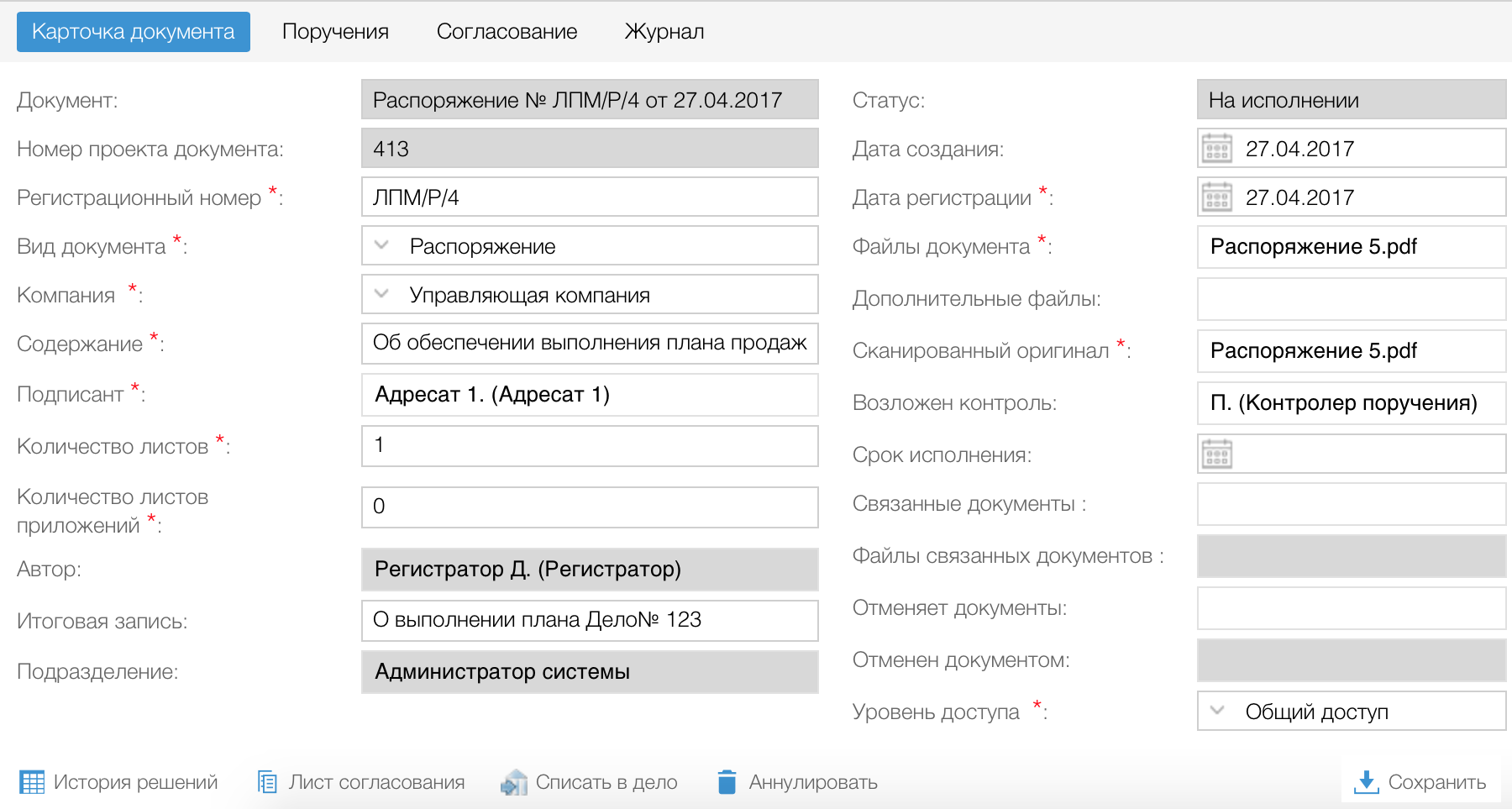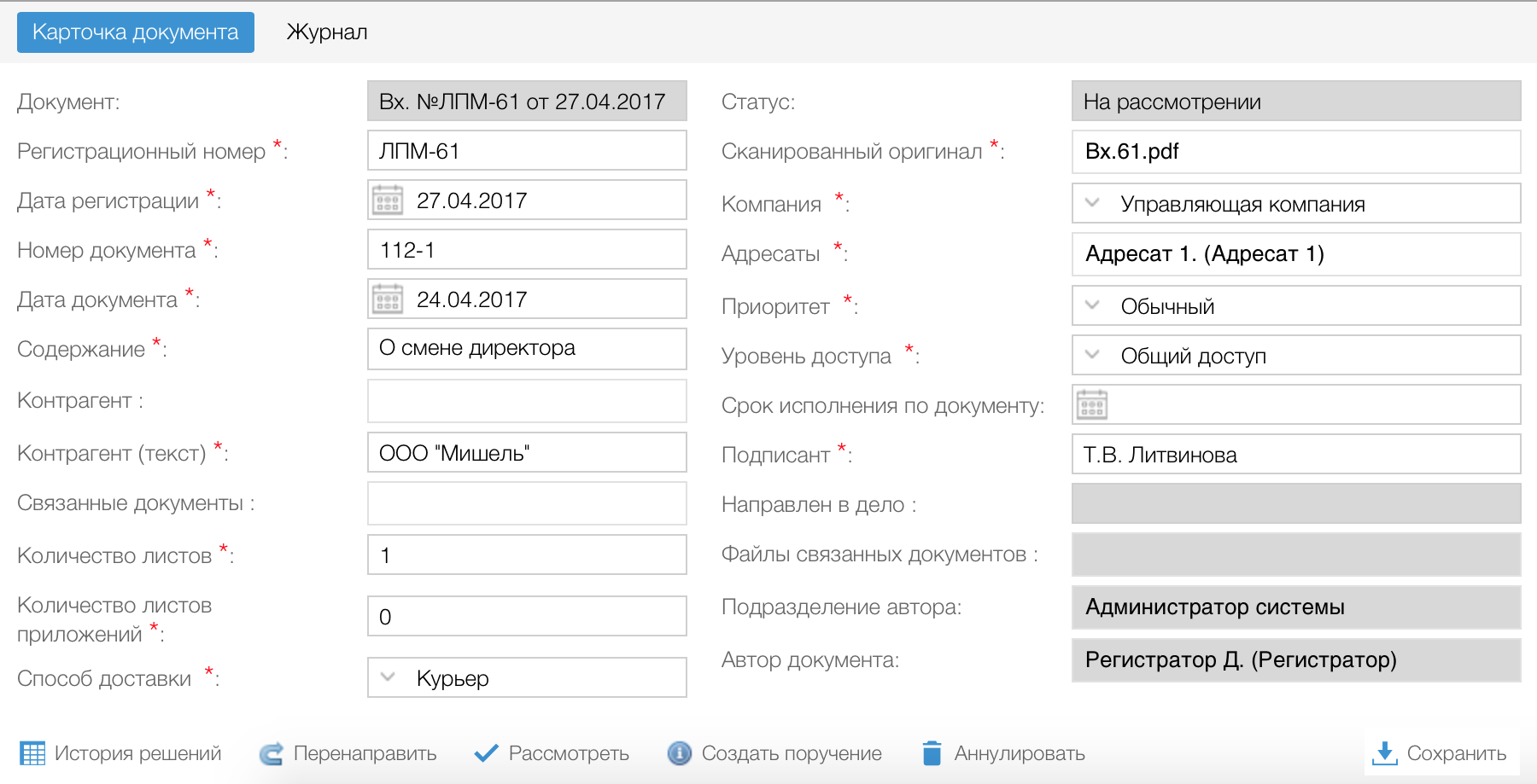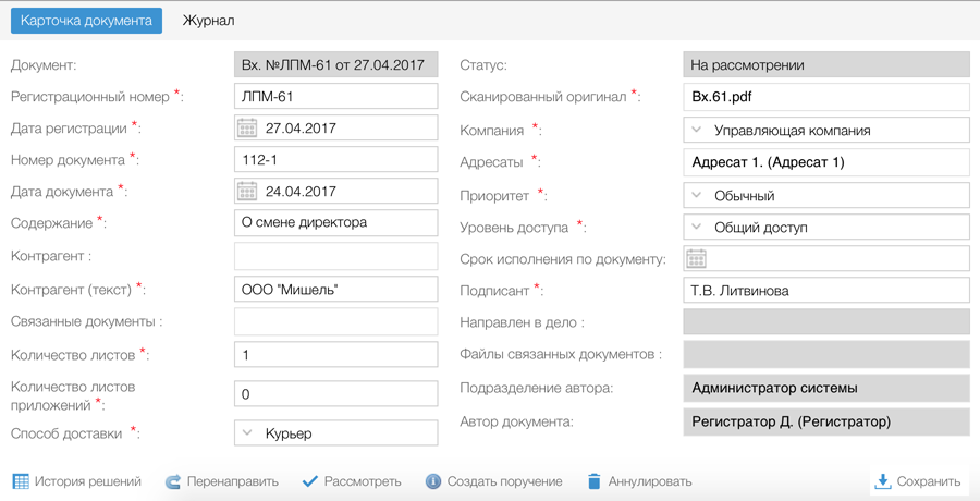 Карточка входящего документа: